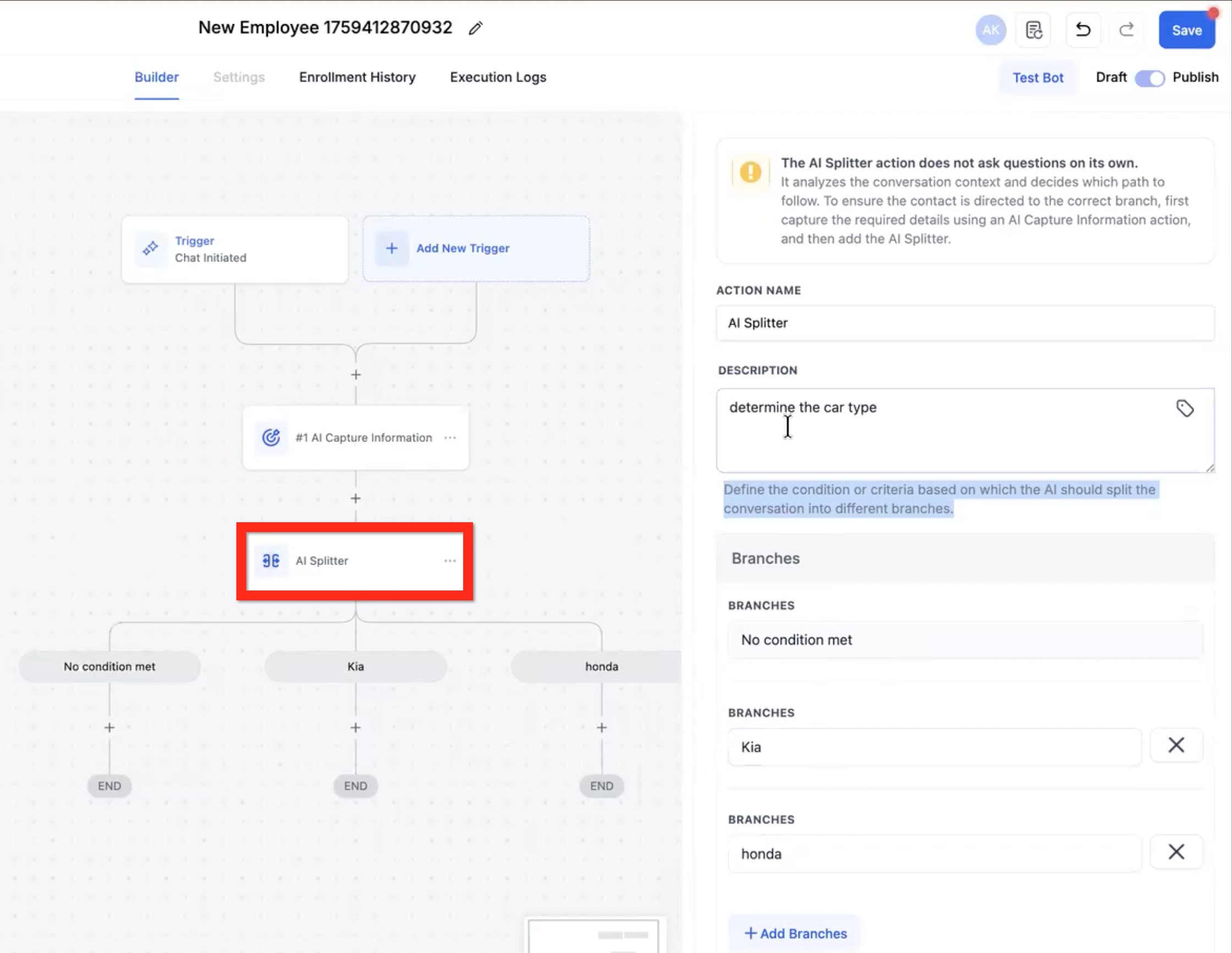 • NOTE: the AI Splitter action does not send messages or collect information. It only analyzes previously collected information.