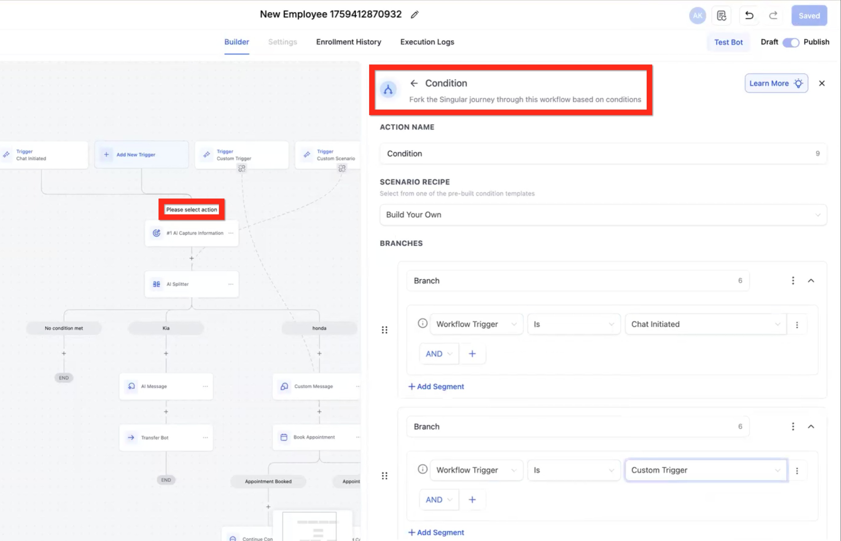 • Branch Workflow Trigger is Custom Trigger 1 - Follow this path if Custom Trigger 1 was fired.