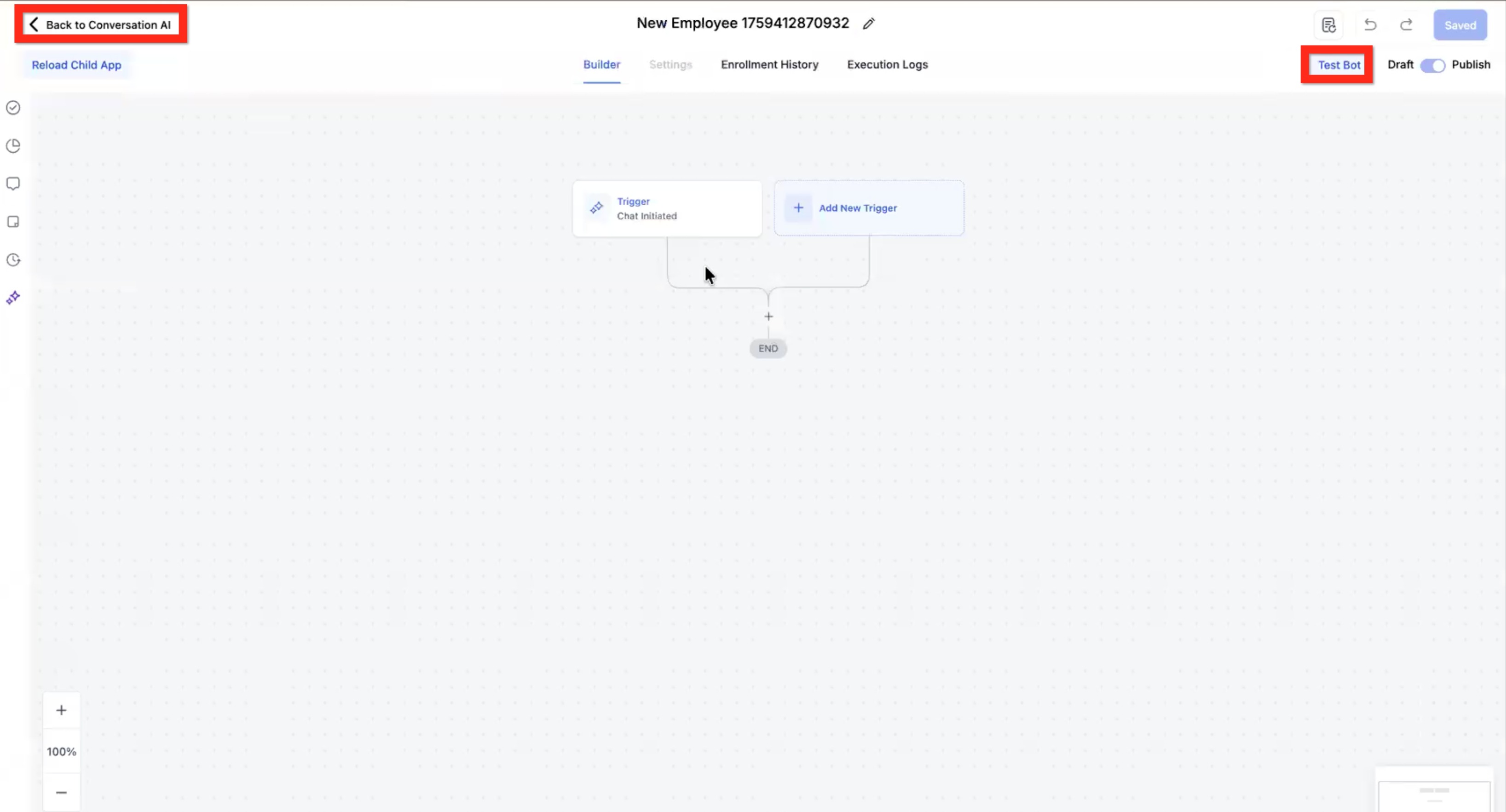 You can tell you're in the AI Flow Builder (not the Automation Workflow builder) because it says "Back to Conversation aI" and "Test Bot" instead of "Workflow".