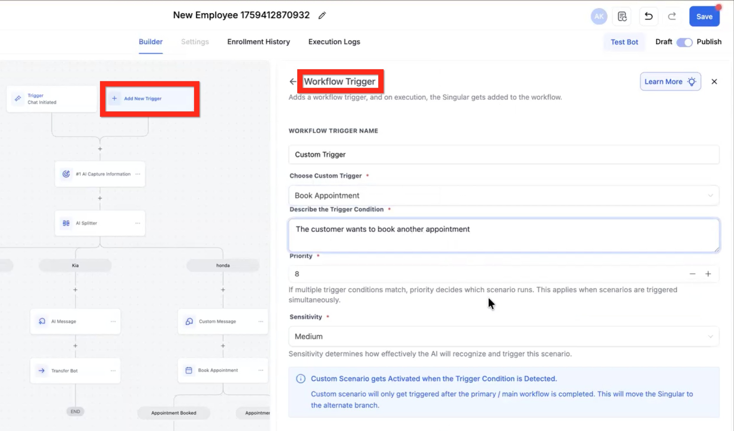 • High = The AI will almost always break the Contact out of the current flow and move to the Custom Trigger.