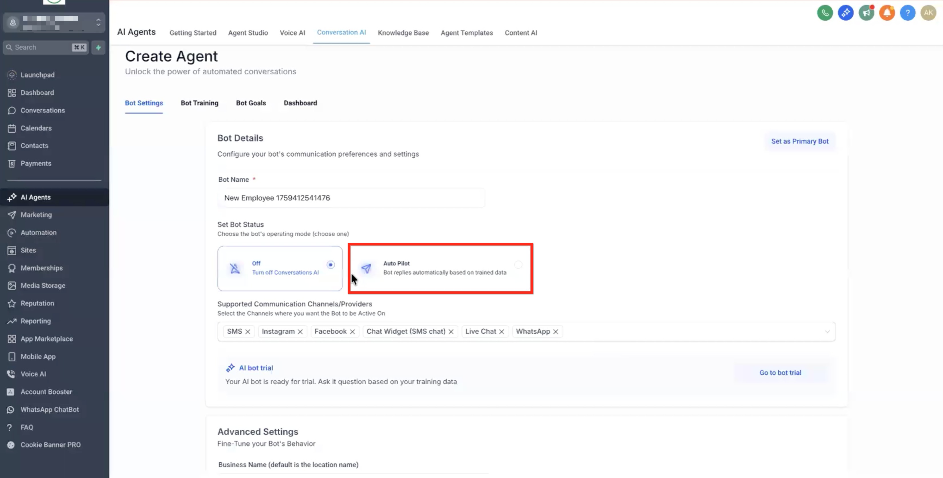 • Set Bot Status to Auto Pilot