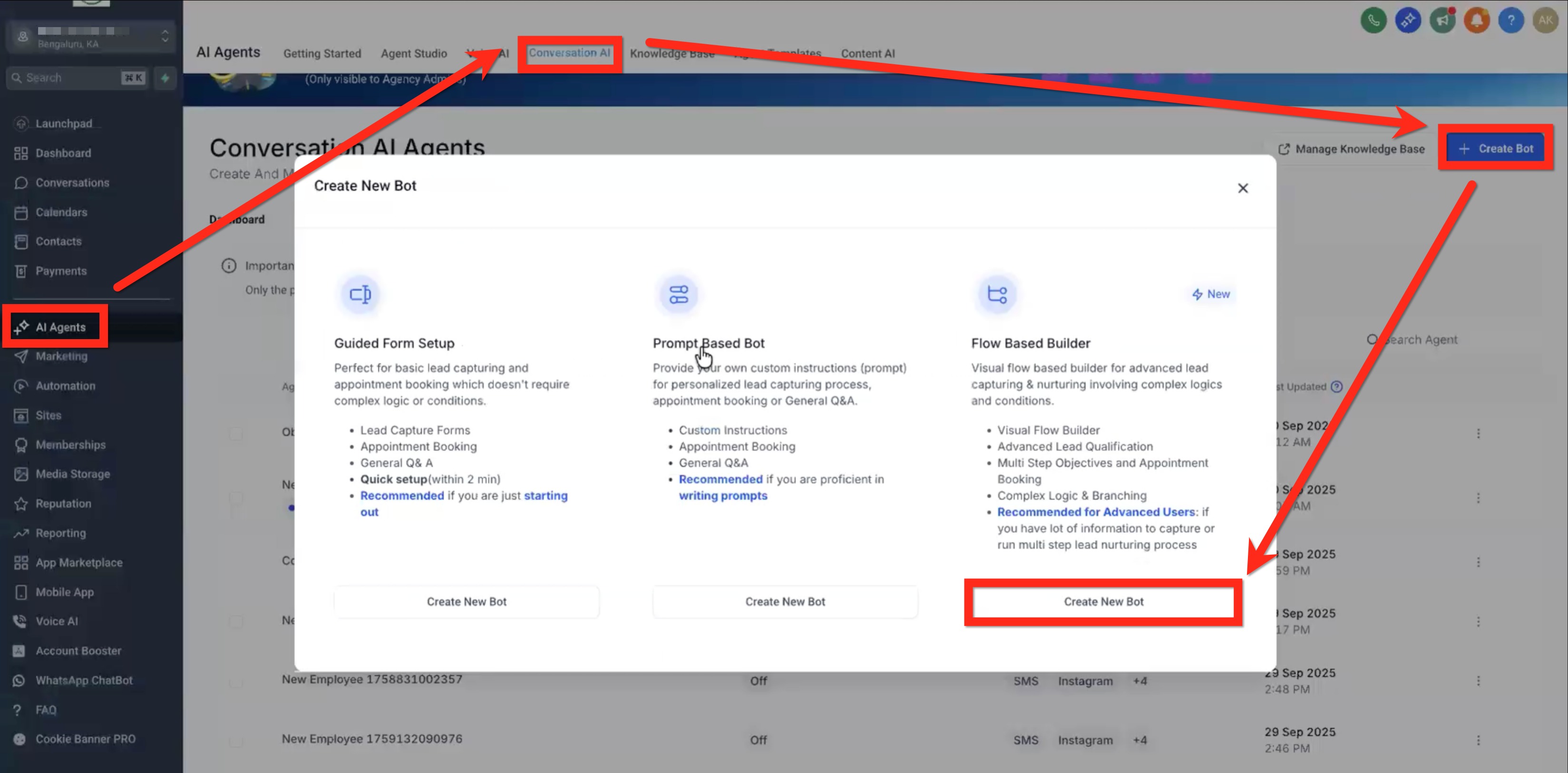 Navigate to AI Agents > Conversation AI > Create Bot button > Create New Bot button (Flow Based Builder)